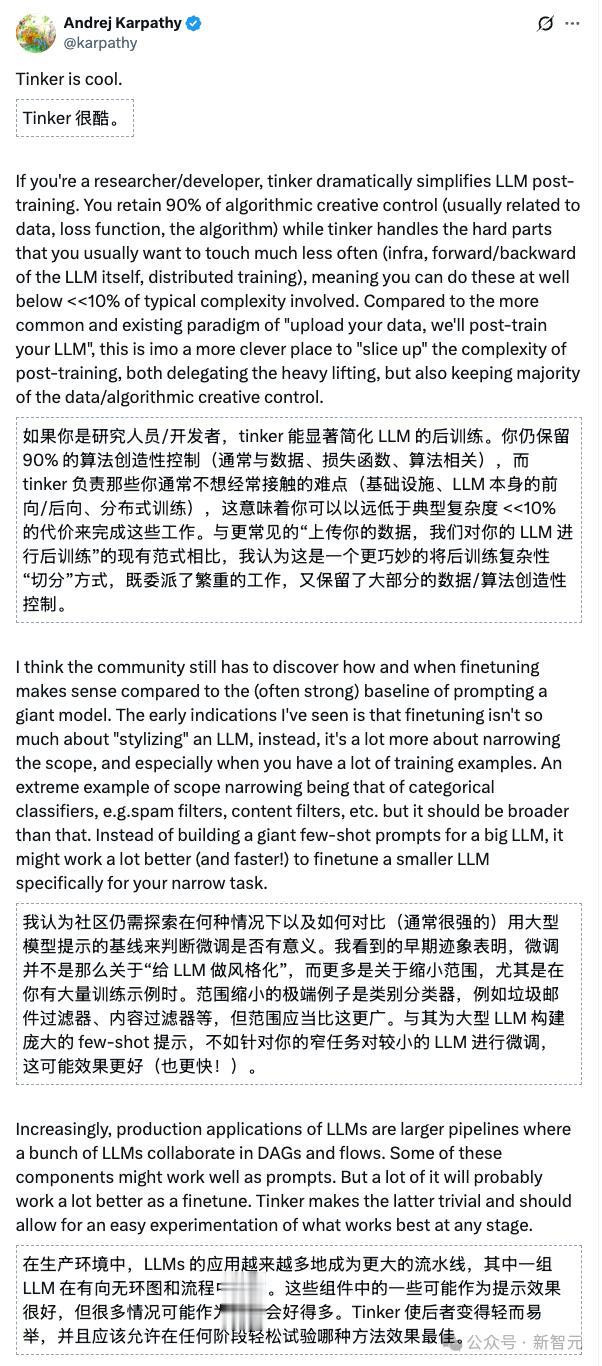 对此,大佬卡帕西也在第一时间发推盛赞,认为Tinker会改变过去模型微调的范式: