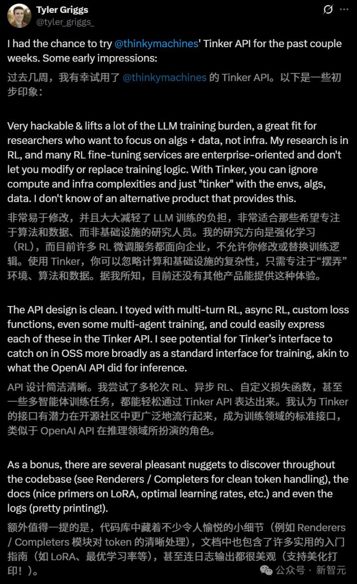 【新智元导读】微调大模型不再是少数人的专利!Thinking Machines Lab推出首款产品「Tinker」,一个专为语言模型微调而生的API。它让开发者能彻底摆脱底层架构的束缚,仅用简单的Python代码便可专注于算法与数据创新。