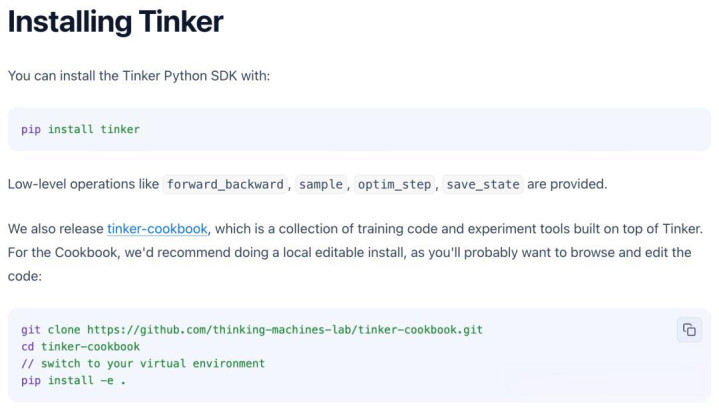提供一个名为Tinker Cookbook的开源配套库,其中包含了多种后训练方法的实现。